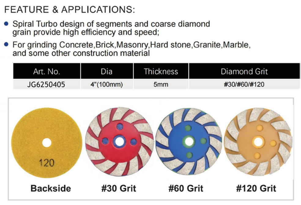 This product series comprises cold-pressed diamond grinding flat wheels designed for concrete grinding and surface preparation. The range includes model JG6250405 with a standard diameter of 4″ (100mm), thickness of 5mm, and diamond grits (#30, #60, #120) to cater to different material removal and finishing needs, featuring a central arbor hole of 20mm for broad equipment compatibility.