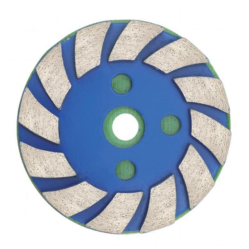 Spiral Turbo Segment Design & Coarse Diamond Grains: Features spiral turbo-shaped segments with coarse diamond grains (embedded in silver sections, paired with blue durable bonding material), delivering high efficiency and speed for aggressive concrete grinding.