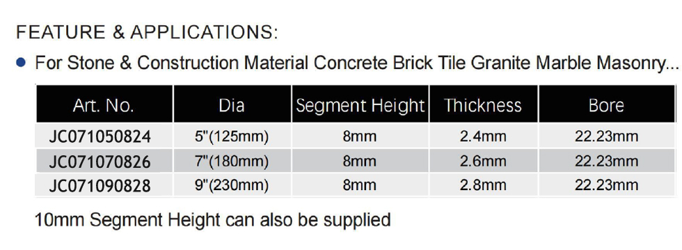 This product series comprises general-purpose cold-pressed segmented diamond blades with T-deep teeth, designed for efficient cutting of hard materials. The range includes multiple models (JC071050824, JC071070826, JC071090828) with diameters of 5″(125mm), 7″(180mm), 9″(230mm), corresponding thicknesses of 2.4mm, 2.6mm, 2.8mm, a consistent bore size of 22.23mm, and an optional 10mm segment height, catering to various cutting depth and precision requirements in construction and renovation projects.
