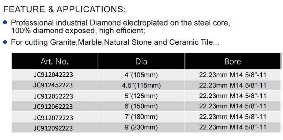 This product series comprises professional industrial electroplated diamond blades designed for cutting hard materials. The range includes multiple models (JC912042223 – JC912092223) with diameters from 4″ (105mm) to 9″ (230mm), all featuring a bore of 22.23mm M14 5/8″-11. The blades adopt a single-sided diamond design with 100% diamond exposure for high-efficiency cutting, making them a reliable choice for general-purpose cutting tasks in construction and renovation projects.