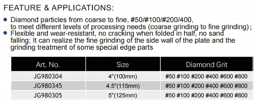 This product series comprises general-purpose electroplated diamond grinding pads (triangle-shaped) designed for versatile manual grinding applications. The range includes three models (JG980304, JG980345, JG980305) with sizes of 4″(100mm), 4.5″(115mm), and 5″(125mm) respectively, supporting diamond grits from coarse (#50) to fine (#800) (including #50, #100, #200, #400, #600, #800), catering to various stages from initial surface grinding to refined edge finishing.