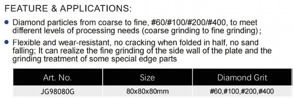 This product series comprises general-purpose electroplated diamond grinding pads with a triangular design, intended for dry manual polishing. The range includes model JG98080G with a standard size of 80×80×80mm, offering multiple diamond grits (#60, #100, #200, #400) to cater to various stages of the grinding process from coarse grinding to fine finishing.