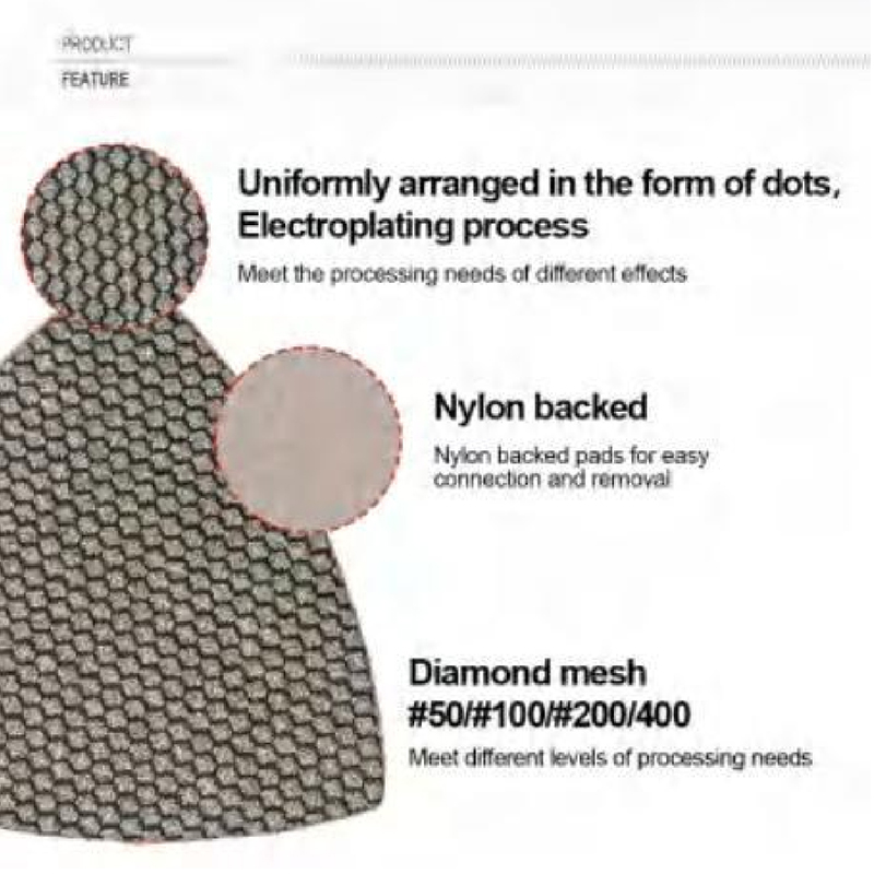High-Quality Diamond Grains: Features diamond particles (from coarse #60 to fine #400) evenly embedded in a diamond mesh texture, providing excellent wear resistance and controlled material removal rates.
