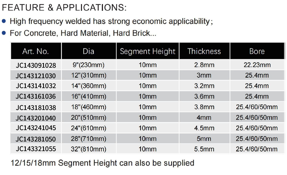This product series comprises high-frequency welded diamond blades designed for cutting concrete, hard materials, and hard bricks. The range includes multiple models (JC143091028, JC143121030, JC143141032, JC143161036, JC143181038, JC143201040, JC143241045, JC143281050, JC143321055) with diameters from 9″(230mm) to 32″(810mm), segment height of 10mm (12/15/18mm also available), thickness ranging from 2.8mm to 5.5mm, and bore sizes varying by diameter (e.g., 22.23mm, 25.4mm, 25.4/60/50mm), catering to diverse cutting depth, precision, and tool compatibility needs in construction and demolition projects.