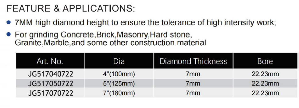 This product series comprises high-frequency welded hollow cylindrical diamond grinding cup wheels designed for general-purpose grinding. The range includes multiple models (JG517040722, JG517050722, JG517070722) with diameters of 4″(100mm), 5″(125mm), and 7″(180mm), a consistent diamond thickness of 7mm, and a standard bore of 22.23mm, catering to various grinding needs from moderate to high-intensity material removal.