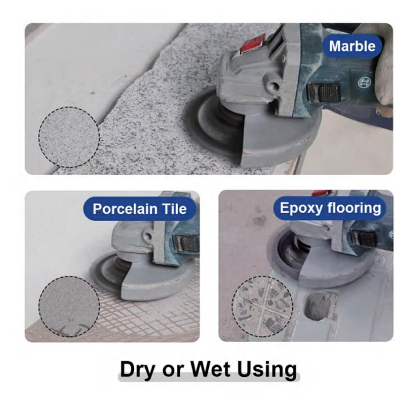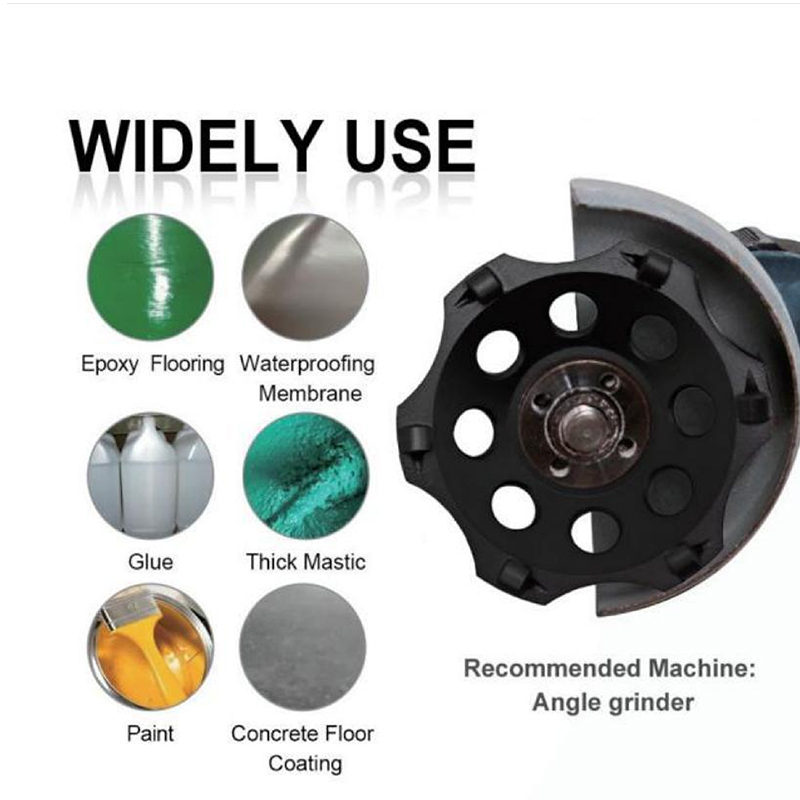 Ideal for removing stubborn surfaces on epoxy floors and concrete, including epoxy coatings, waterproofing membranes, glue, thick mastic, paint, and other concrete floor coatings. Suitable for aggressive material removal, surface preparation, and grinding in epoxy floor renovation, hard coating treatment, and concrete surface conditioning scenarios.