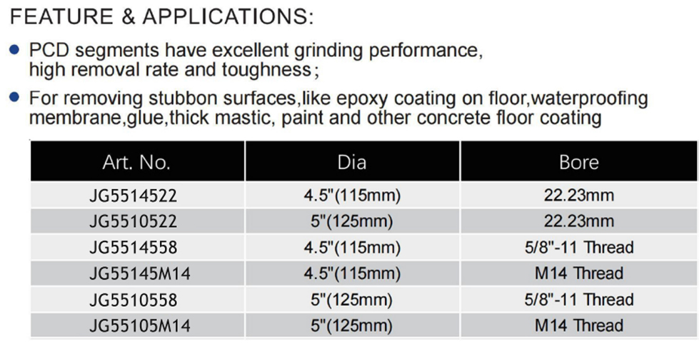 This product series comprises high-frequency welded PCD grinding cup wheels designed for epoxy floor removal and processing of stubborn hard surfaces. The range includes multiple models (JG5514522, JG5510522, JG5514558, JG55145M14, JG5510558, JG55105M14) with diameters of 4.5″(115mm) and 5″(125mm), and bore types including 22.23mm, 5/8”-11 Thread, and M14 Thread, catering to diverse equipment compatibility and grinding depth requirements.