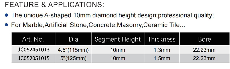 This product series comprises hot pressed A-shape diamond blades specifically engineered for cutting ceramic and porcelain materials. The range includes multiple models (JC052451013, JC052051015) with diameters of 4.5″(115mm) and 5″(125mm), featuring a standard bore of 22.23mm, segment height of 10mm, and thicknesses of 1.3mm (for 4.5″) or 1.5mm (for 5″). The blades adopt a distinct A-shaped segment profile along the cutting edge, with strategic ventilation holes in the core for heat dissipation, catering to precise cutting needs for hard, brittle tile applications.