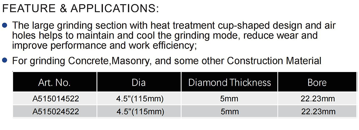 This product series comprises hot pressed cyclone-shaped diamond grinding cup wheels designed for general-purpose grinding of construction materials. The range includes multiple models (A515014522, A515024522) with a standard diameter of 4.5″(115mm), diamond thickness of 5mm, and bore of 22.23mm, catering to material removal and surface preparation tasks in construction applications.