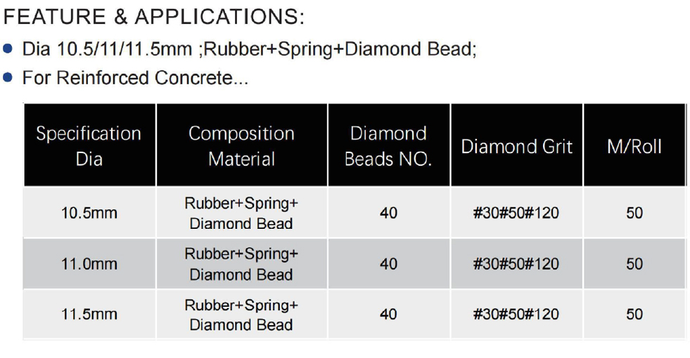 - Multi-Specification Versatility: Available in three diameters (10.5mm, 11.0mm, 11.5mm) and three diamond grits (#30 for coarse cutting, #50 for medium, #120 for fine finishing), with a consistent bead count of 40 per meter (M/Roll) to suit different cutting depths and precision requirements.