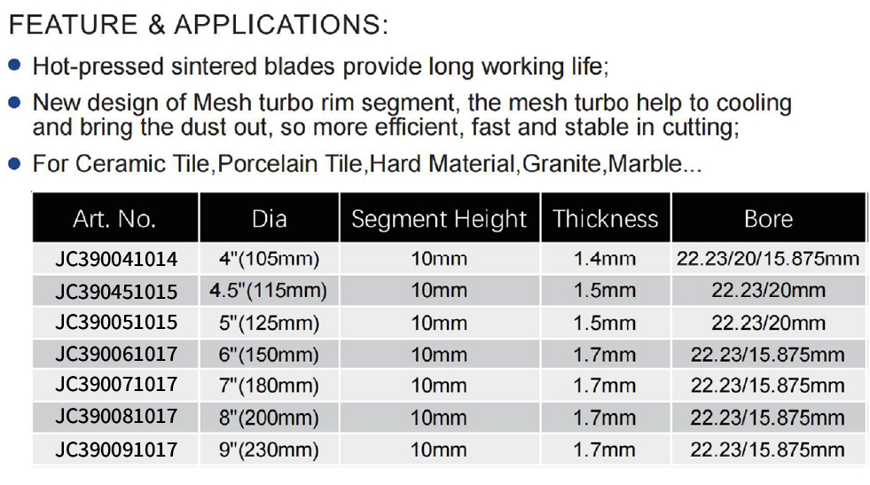 This product series comprises hot pressed sintered K mesh diamond blades designed for cutting ceramic, porcelain, and other hard materials. The range includes multiple models (JC390041014, JC390451015, JC390051015, JC390061017, JC390071017, JC390081017, JC390091017) with diameters ranging from 4″ (105mm) to 9″ (230mm), all featuring a consistent segment height of 10mm, thickness from 1.4mm to 1.7mm, and bore sizes typically including 22.23mm, 20mm, and 15.875mm (specifications vary by model).