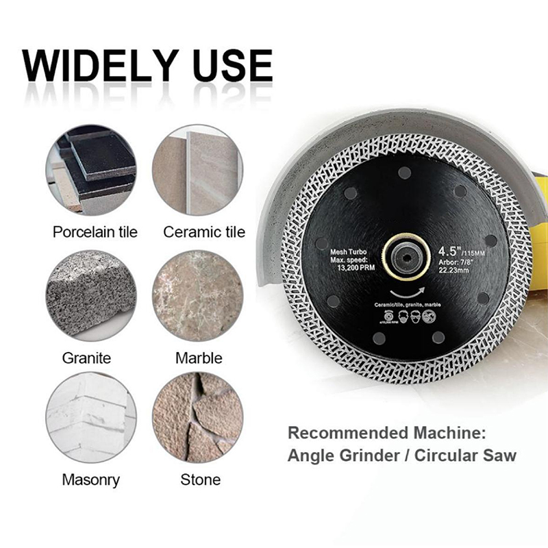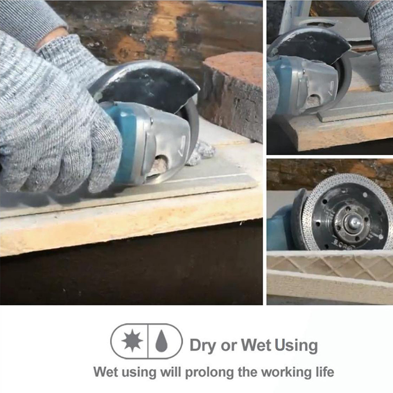 Ideal for cutting and shaping a variety of hard materials including ceramic tiles, porcelain tiles, granite, marble, masonry, and stone. Designed for precise and efficient cutting operations in construction and renovation projects (e.g., tile installation, stone slab processing). Compatible with angle grinders or circular saws, supporting both dry (convenient for quick tasks) and wet (extended life for heavy-duty use) cutting scenarios. Essential for professional tile and stone cutting tasks requiring durability and versatility.