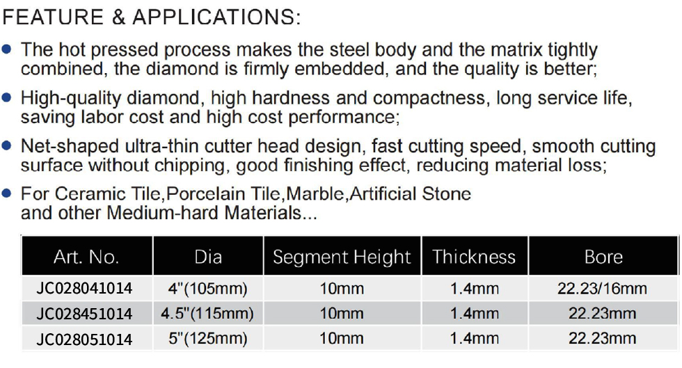 This product series comprises hot pressed mesh turbo diamond blades engineered for cutting ceramic, porcelain, marble, artificial stone, and other medium-hard materials. The range includes multiple models (JC028041014, JC028451014, JC028051014) with diameters from 4″ (105mm) to 5″ (125mm), all featuring a consistent segment height of 10mm and thickness of 1.4mm, catering to varied cutting applications from precision trimming to standard material sizing.