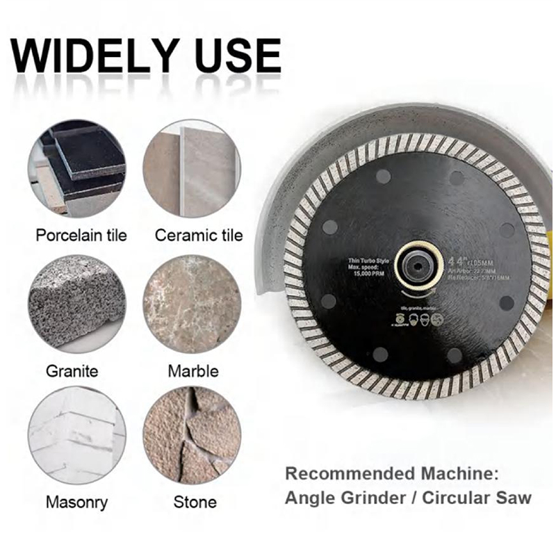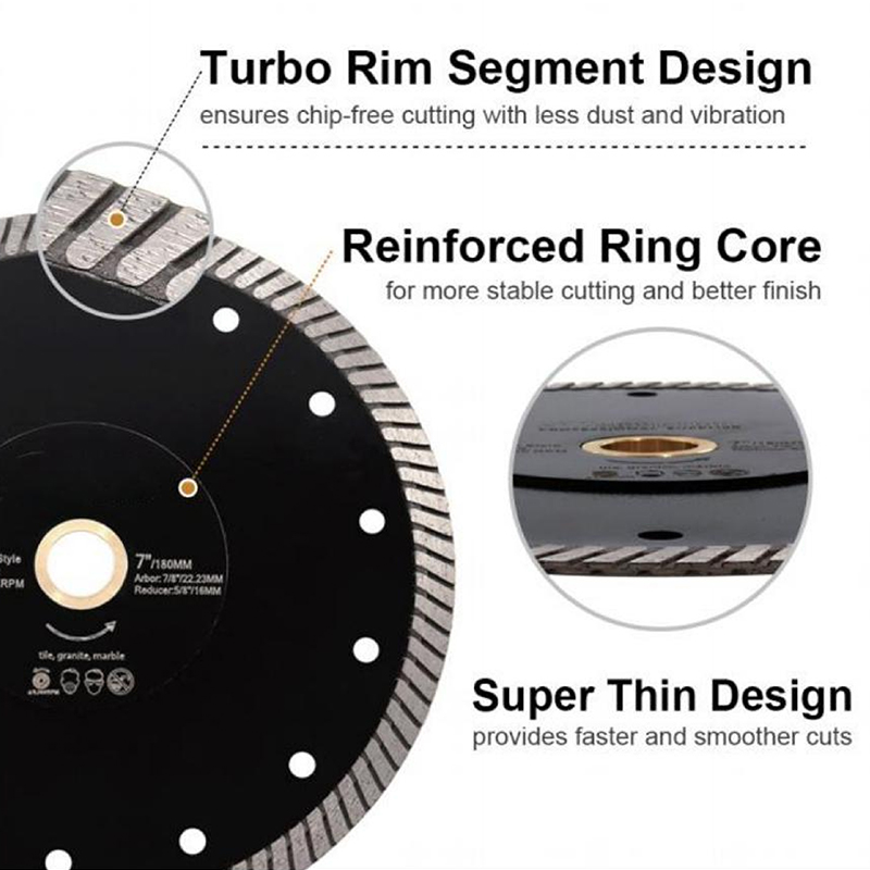 - Turbo Rim Design: Promotes faster debris clearance, minimizes friction and vibration, reduces chipping, and enables chip-free cutting with less dust during operation.
