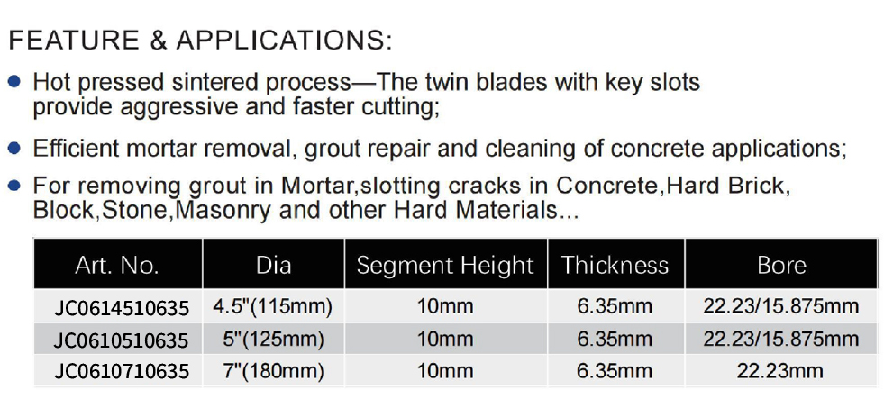 This product series comprises hot pressed segmented diamond blades with double-blade design for general purpose cutting, especially optimized for tuck-pointing. The range includes multiple models (JC0614510635, JC0610510635, JC0610710635) with diameters of 4.5″ (115mm), 5″ (125mm), and 7″ (180mm), all featuring a segment height of 10mm, thickness of 6.35mm, and bore sizes (22.23/15.875mm for 4.5″/5″ models; 22.23mm for 7″ model), catering to various cutting needs from general material removal to specialized mortar groove repair.
