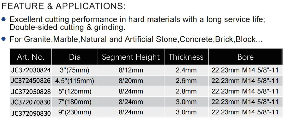 This product series comprises hot pressed turbo cutting & grinding diamond blades designed for general purpose. The range includes multiple models (JC372030824, JC372450826, JC372050828, JC372070830, JC372090830) with diameters ranging from 3″ (75mm) to 9″ (230mm), segment heights of 8/12mm to 8/24mm, and thicknesses of 2.4mm to 3.0mm, catering to diverse cutting depths and material removal needs.