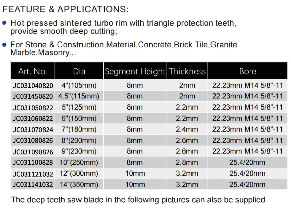 This product series comprises general-purpose hot pressed turbo diamond blades with protective teeth designed for efficient cutting of hard materials. The range includes multiple models (e.g., JC031040820, JC031450820, JC031050822, JC031141032, A0314508M14) with diameters spanning 4″ (105mm) to 14″ (350mm), featuring varied segment heights (8mm/10mm), thicknesses (2mm/2.8mm/3.2mm), and bores (22.23mm M14 5/8″-11, 25.4/20mm), catering to diverse cutting depth, precision, and equipment compatibility needs.