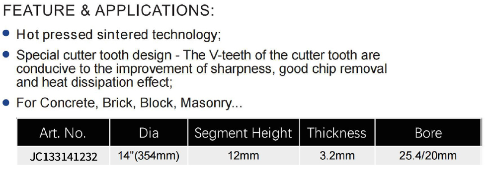 This product series comprises hot pressed sintered diamond blades with a special V-teeth cutter design, tailored for efficient cutting of hard construction materials. The range includes models such as JC133141232, featuring a diameter of 14″ (354mm), segment height of 12mm, thickness of 3.2mm, and bore of 25.4/20mm, catering to demanding cutting tasks from rough shaping to precise masonry processing.