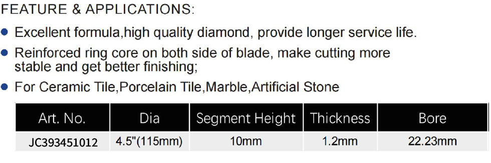 - Standardized Specifications: Identified by Art. No. JC393451012, with a diameter of 4.5″ (115mm), segment height of 10mm, thickness of 1.2mm, and bore of 22.23mm, ensuring compatibility with common cutting equipment.