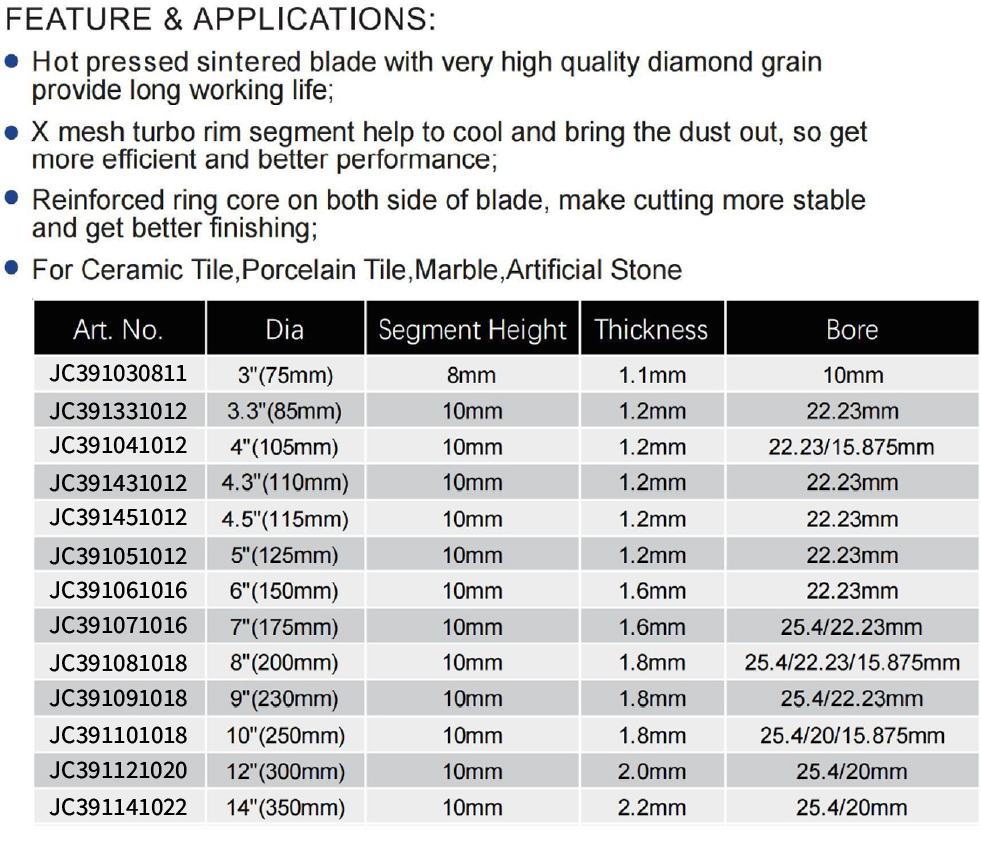This product series comprises hot pressed sintered diamond blades with reinforced ring cores, designed for cutting ceramic, porcelain, marble, and artificial stone. The range includes multiple models (e.g., JC391030811 to JC391141022) with diameters spanning 3″ (75mm) to 14″ (350mm), segment heights of 8–2.2mm, thicknesses of 1.1mm–2.2mm, and bore sizes accommodating 10–25.4mm arbor configurations. Featuring X mesh turbo rim segments and dual-side reinforcements, the blades enhance cooling, dust extraction, and cutting stability, catering to professional tiling and material processing needs from small to large-scale applications.