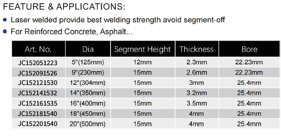 • Adaptive Model Specifications: Offers diameter variants (5″-20″), incremental thickness (2.3mm-4mm), and segment height adjustments (12mm for smaller blades, 15mm for larger ones) to match cutting intensity and application requirements.