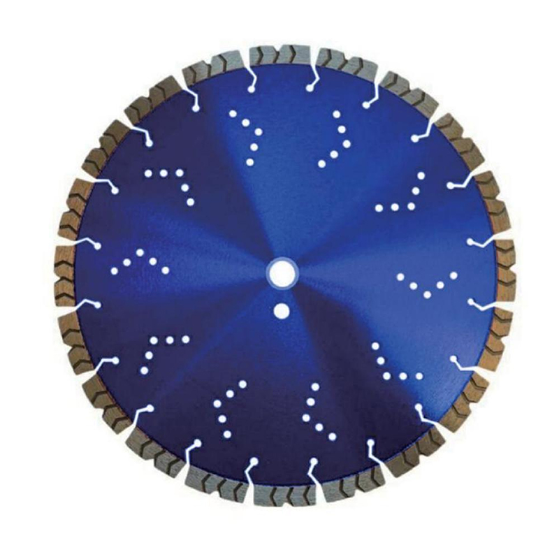 • Dual-Layer Cutting Structure: Combines a metallic blue main surface with laser-welded diamond dots (radial pattern) for core cutting, surrounded by a brownish-grey outer segment (sintered metal-bonded diamonds) for durability; white arrow markings aid in cooling and debris removal during high-speed rotation.