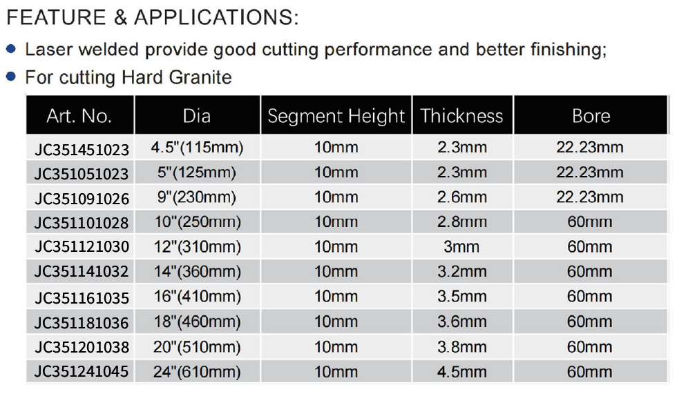 This product series comprises laser welded diamond blades specifically designed for cutting granite (non-silent type), offering good cutting performance and better finishing. The range includes multiple models (JC351451023, JC351051023, JC351091026, JC351101028, JC351121030, JC351141032, JC351161035, JC351181036, JC351201038, JC351241045) with diameters from 4.5″ (115mm) to 24″ (610mm), featuring a standard circular shape with a central mounting hole and evenly spaced segment notches along the outer edge, catering to various granite cutting depths and precision requirements.