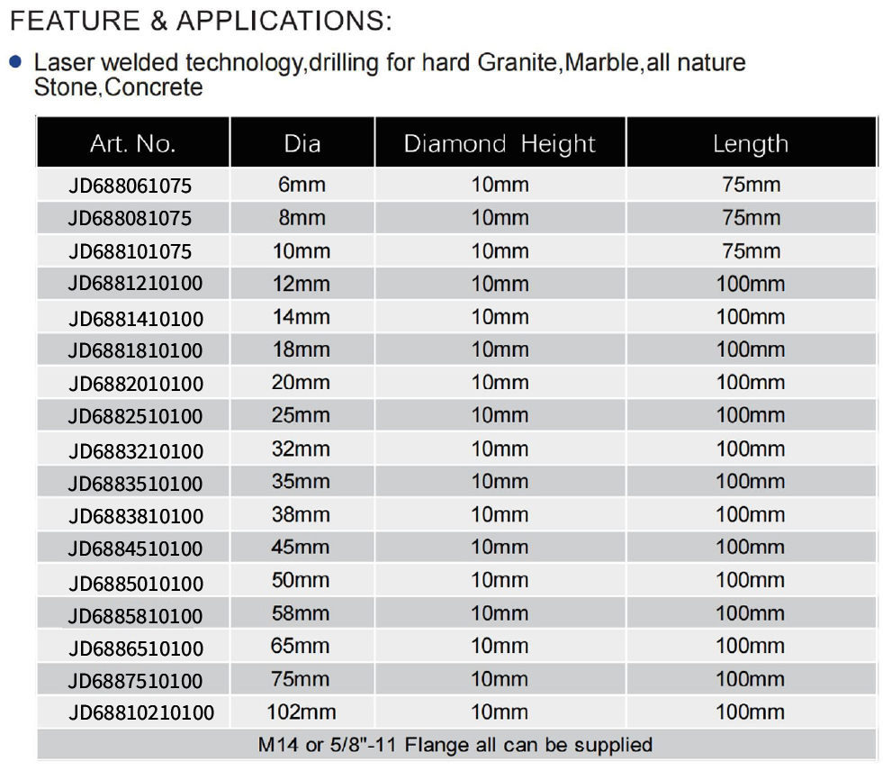 This product series comprises laser-welded diamond drill bits with protective bodies designed for general-purpose drilling in hard materials. The range includes multiple models (JD688061075, JD688081075, JD688101075, JD6881210100, JD6881410100, JD6881810100, JD6882010100, JD6882510100, JD6883210100, JD6883510100, JD6883810100, JD6884510100, JD6885010100, JD6885810100, JD6886510100, JD6887510100, JD68810210100) with diameters from 6mm to 102mm, a consistent diamond height of 10mm, and lengths of 75mm or 100mm. It features compatible M14 or 5/8″-11 flanges for easy attachment to drilling machines, catering to diverse drilling depth and precision needs.