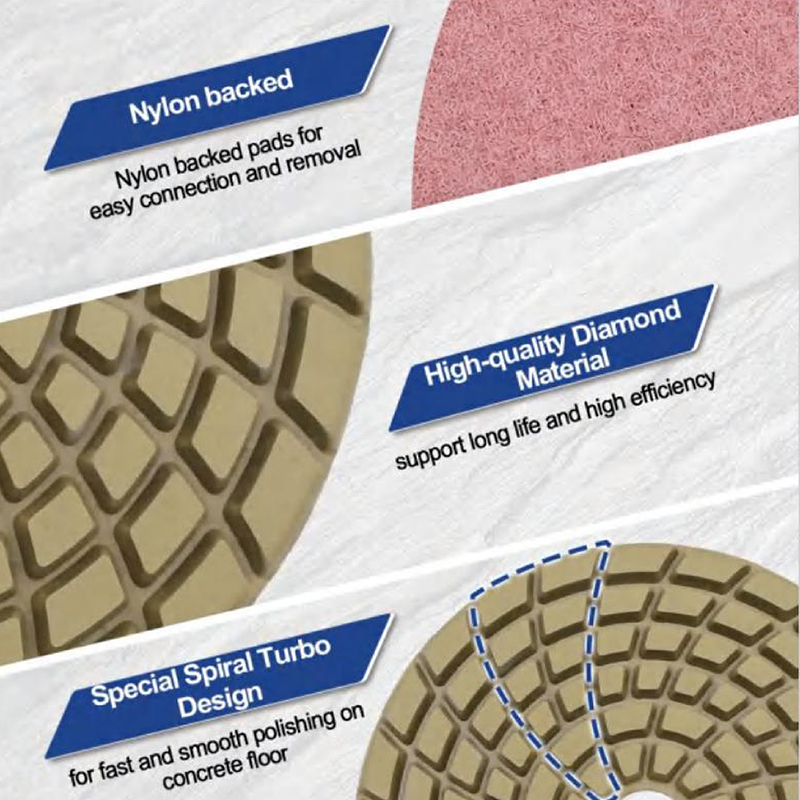 • Specialized Design for Stone & Concrete: Engineered for stone polishing (featuring dense, regular square/micro-pyramidal abrasive areas as shown in images) and effective for concrete polishing; includes a central circular hole for easy machine mounting.