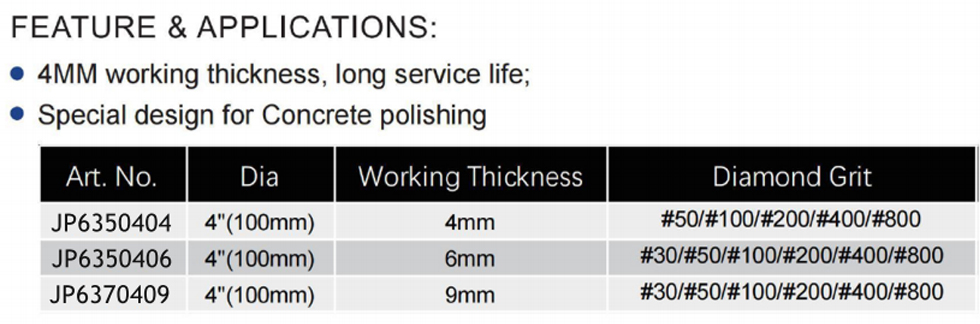 This product series comprises resin bond diamond dry&wet polishing pads with thickened structure, designed for stone and concrete polishing. The range includes multiple models (JP6350404, JP6350406, JP6370409, and 400-grit model) with a standard diameter of 4″(100mm) and working thickness options of 4mm, 6mm, and 9mm, catering to various stages of the polishing process from coarse grinding to fine finishing.
