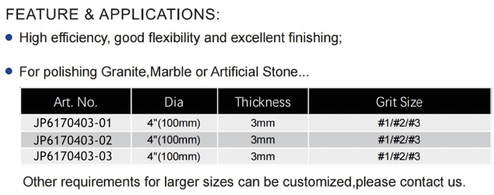 This product series comprises resin-bond flexible diamond dry&wet polishing pads for stone designed for 3-step polishing. The range includes multiple models (JP6170403-01, JP6170403-02, JP6170403-03) with a standard diameter of 4″ (100mm) and thickness of 3mm, catering to various stages of the polishing process from coarse grinding (#1) to fine finishing (#3).