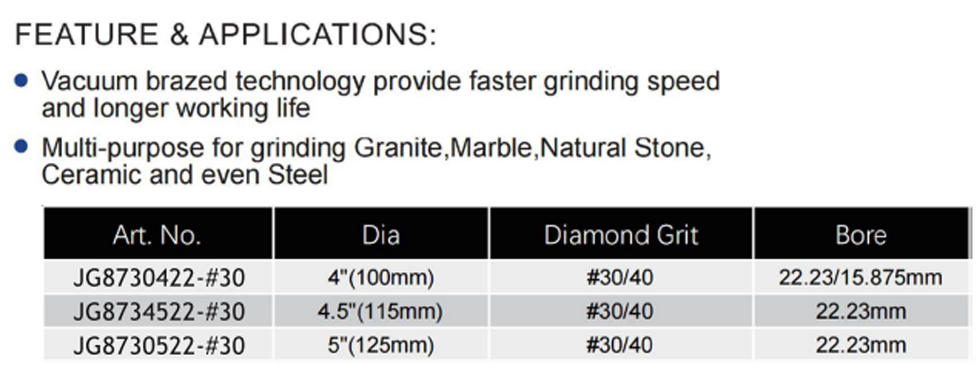 • Standardized Specifications: Clear identification via article numbers (JG8730422-#30, etc.), diameter (4″/100mm, 4.5″/115mm, 5″/125mm), and bore size, meeting universal tool compatibility.