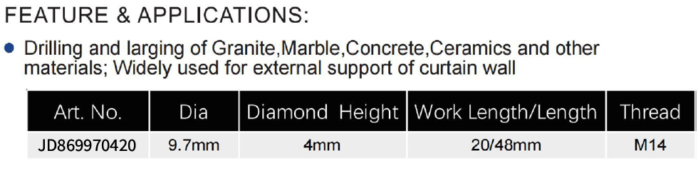 - Standardized Specifications: Clear dimensional markings (Art. No. JD869970420, 9.7mm dia., 4mm diamond height, 20/48mm work/overall length, M14 thread) for easy identification and equipment compatibility.