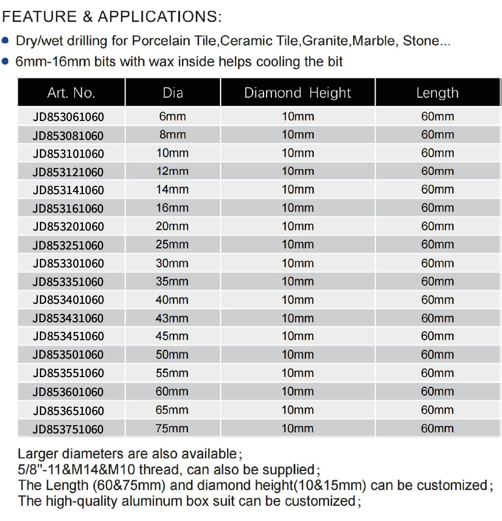 This product series comprises vacuum brazed diamond drill bits designed for dry/wet drilling of ceramic, porcelain, stone, granite, and marble. The range includes multiple models (JD853061060 – JD853751060) with diameters from 6mm to 75mm, a consistent diamond height of 10mm, and a length of 60mm. 6-16mm bits feature wax inside for cooling, while larger diameters, specific threads (5/8″-11, M14, M10), customizable lengths (60/75mm), diamond heights (10/15mm), and high-quality aluminum box suits are available.