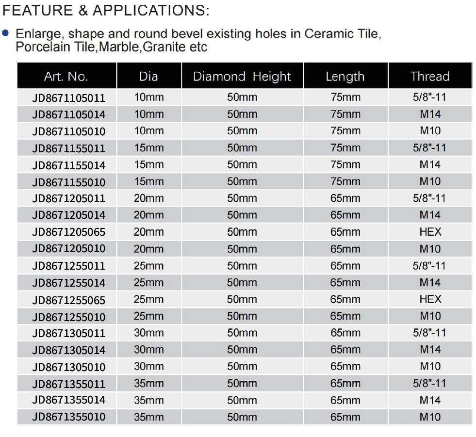 This product series comprises vacuum-brazed diamond finger bits designed for working on ceramic, porcelain, and stone. The range includes multiple models (e.g., JD8671105011, JD8671105014, JD8671105010, JD8671155011, JD8671205011, JD8671255065, JD8671305010, JD8671355014) with customizable specifications—diameters from 10mm to 35mm, diamond height of 50mm, lengths of 65mm to 75mm, and versatile threading types (5/8″-11, M10, M14, HEX)—catering to various tasks from hole modification to detailed surface finishing.